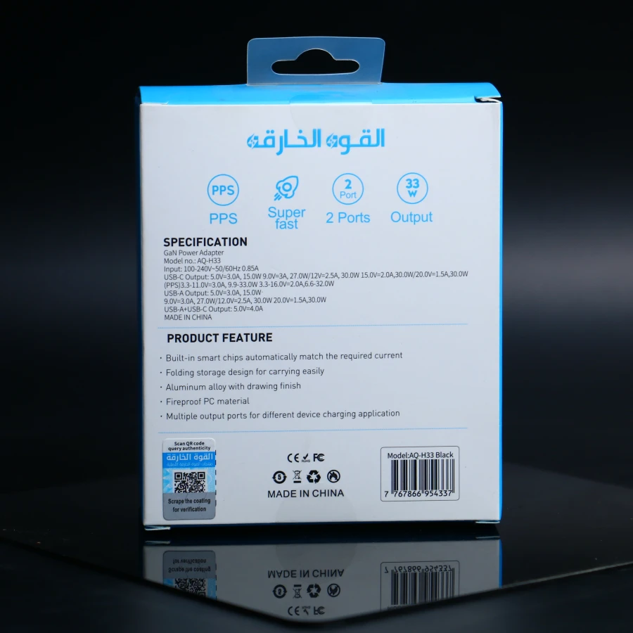 USB-COutDut 5.0 فولت = 30 أمبير، 150 واط 9.0 فولت = 3 أمبير، 27.0 واط/12 فولت = 2.5 أمبير، 30.0 واط، 15.0 فولت = 2.04، 30.0 واط/20.0 فولت = 1.5 أمبير، 30.0 واط