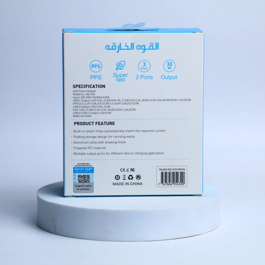 USB-COutDut 5.0 فولت = 30 أمبير، 150 واط 9.0 فولت = 3 أمبير، 27.0 واط/12 فولت = 2.5 أمبير، 30.0 واط، 15.0 فولت = 2.04، 30.0 واط/20.0 فولت = 1.5 أمبير، 30.0 واط
