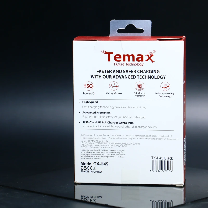 مخرج USB-A: ٥ فولت ٣ أمبير/٩ فولت ٢ أمبير/١٢ فولت ١.٥ أمبير SCP (QC ١٨ واط)